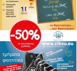 Νέα μεγάλη πρσφορά από το φροντιστήριο μας με έκπτωση 50% σε νέους μαθητές! Πλέον εκτός από την εξασφαλισμένη επιτυχία στις εξετάσεις όλων των επιπέδων και την εξαιρετική ποιότητα διδασκαλίας, προσφέρουμε και τις καλύτερες τιμές στην πόλη! ΕΓΓΡΑΦΗ: ΔΩΡΕΑΝ LOWER: 85 € / μήνα PROFICIENCY: 85 € / μήνα Επικοινωνήστε σήμερα μαζί μας και εξασφαλίστε τη […]